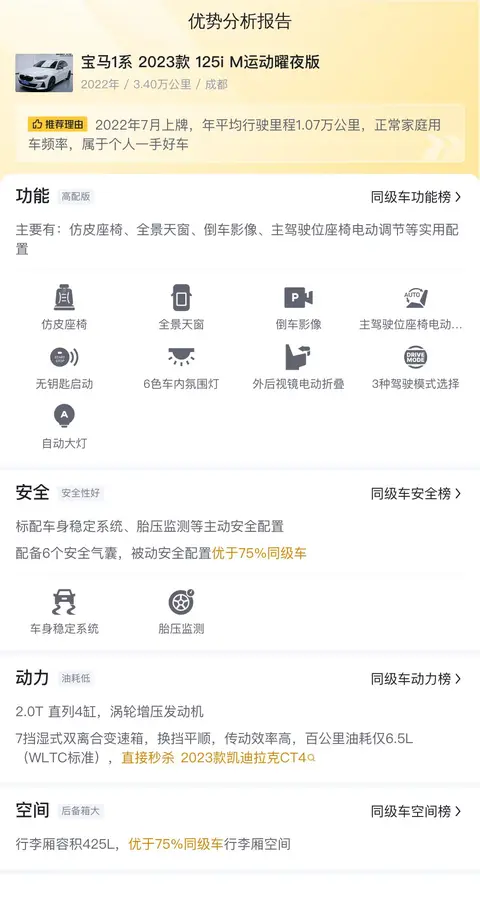 在二手车市场中,价格的决定因素不仅仅是车辆的年份和里程数,更重要的是车辆的实际状况。今天,我们要向您介绍的是一辆特别的宝马1系2023款125i M运动曜夜版。这辆车的行驶里程仅为3.4万公里,且为一手车,从未有过过户记录,这意味着它有着较低的使用频率和更好的保养状态。考虑到这些积极因素,我们有理由相信,这辆车的售价应当低于一般的市场水平。实际上,根据懂车帝给出的数据,这辆宝马1系2023款125i M运动曜夜版的售价确实如此。它的售价为11.68万元,相较于其他同款车型,这个价格显得相当有竞争力。通常,宝马1系2023款125i M运动曜夜版的二手售价会在13.67万元至16.28万元之间。但需要注意的是,车辆的最终售价会受到多种因素的影响,包括车龄、里程数、保养状况以及市场供需关系等。因此,每一辆二手车的实际售价都会有所不同。对于那些正在寻找一辆性价比高的宝马1系二手车的消费者来说,这辆行驶里程短、车况良好、且售价合理的宝马1系2023款125i M运动曜夜版无疑是一个值得考虑的选择。