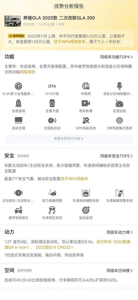 这辆奔驰GLA 2022款 GLA 200,心脏可是相当强壮哦!搭载了一颗1.3T直列4缸涡轮增压发动机,每一次呼吸都充满了力量。最大功率120kW,最大扭矩250N·m,这样的动力配置,让你在城市中穿梭自如,想超谁就超谁!想要更快的速度?没问题!这辆车的最高车速可达190km/h,虽然不是火箭发射,但也足够让你感受风驰电掣的快感了!想要更稳定的行驶?7挡双离合变速箱来帮忙!换挡平顺迅速,让你在行驶过程中如同鱼儿在水中游弋一般自如。无论是低速行驶还是高速行驶,它都能为你提供稳定而可靠的动力输出。奔驰GLA 2022款 GLA 200还采用了前麦弗逊式独立悬挂和后多连杆式独立悬挂的组合,这样的配置让车辆在行驶过程中更加平稳,即使是在颠簸的路面上行驶,也能为你提供舒适的乘坐体验。还配备了电动助力系统,让你在驾驶过程中更加轻松省力,无论是在城市中穿梭还是在郊外探险,都能轻松应对。兄弟,坐稳了,咱们出发吧!