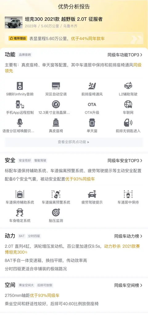 接下来咱们聊一聊这辆坦克300的配置。在舒适配置上,这款车配有真皮座椅、单天窗等,其中车道居中保持和前排座椅通风同级领先。在安全配置上,这款车标配车道保持辅助系统、车道偏离预警系统、疲劳驾驶提示等主动安全配置,被动安全配置上配备6个安全气囊,使其优于58%同级车。在动力性能上,2.0T 直列4缸,涡轮增压发动机,百公里加速仅9.5s,动力秒杀2021款赛博坦克300,8AT手自一体变速箱,换挡平顺,传动效率高,分时四驱更适合非铺装的极端路况。