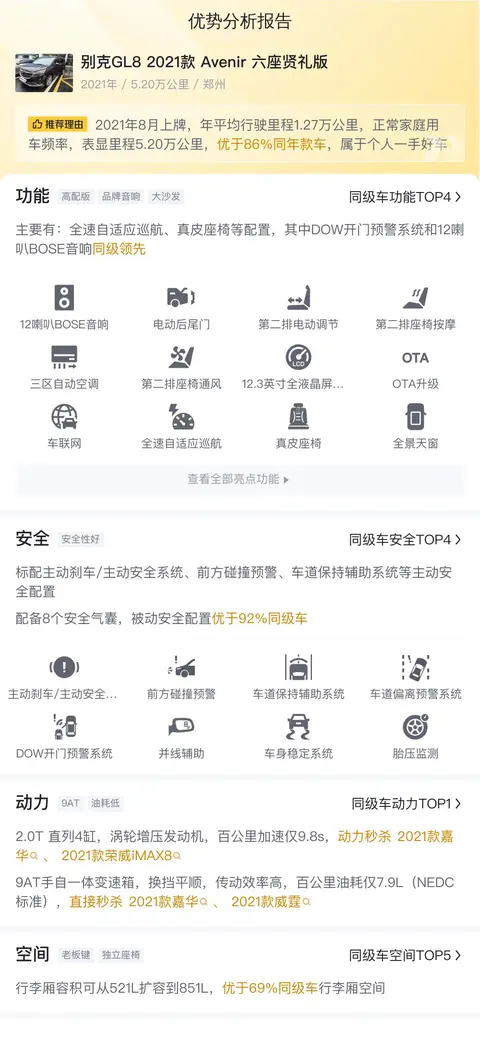 综上所述的新车含税价、用车成本、市场行情、优势分析、同款比价等数据仅供参考。在配置部分,因为二手车非标品,车辆可能会存在配置改装的情况,具体车况信息需要线下结合车辆实际情况进行综合参考。