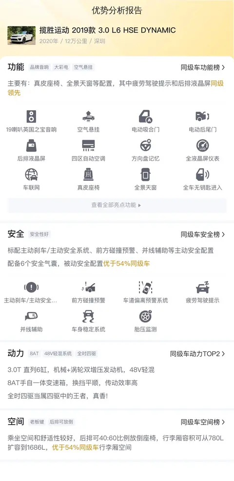 该车辆是一辆2019款路虎揽胜运动3.0 L6 HSE DYNAMIC,采用白色外观,符合国六排放标准,上牌时间为2020年1月,牌照及车辆所在地均在深圳,表显里程为12万公里,有过4次过户记录,目前该车报价为40.8万元。