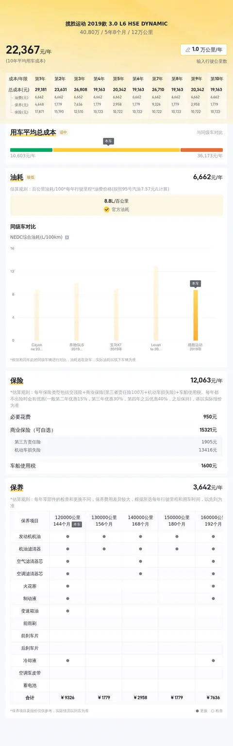 在购买二手车时,除了购车成本外,还需要考虑日常使用和保养的成本。基于懂车帝的大数据,我们可以估算出这辆路虎揽胜运动版的平均年度用车成本大约为2.2万元左右。这一数字涵盖了燃油、保险以及保养等方面的合理支出,但不包括任何额外的消费或节省措施。