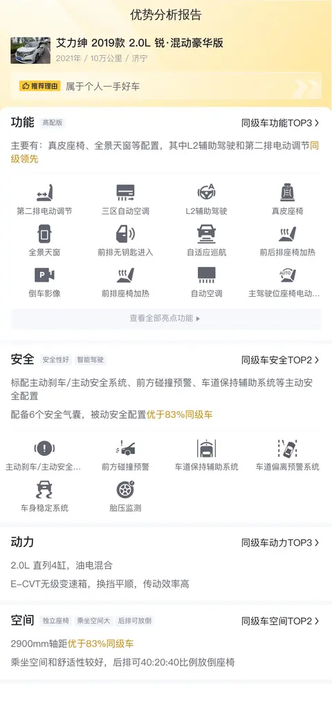总结:在众多的二手车选择中,艾力绅2019款2.0L锐·混动豪华版以其卓越的性能、宽敞舒适的空间、丰富的配置以及低廉的用车成本,无疑成为了一款值得考虑的车型。它不仅能够满足家庭出行的各种需求,更能够在日常使用中为你带来更多的便捷与乐趣。如果你正在寻找一款高品质的MPV作为家庭用车,那么这位“省油小王子”绝对是一个不错的选择。