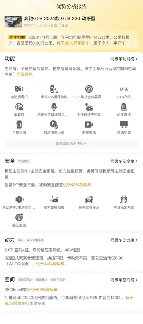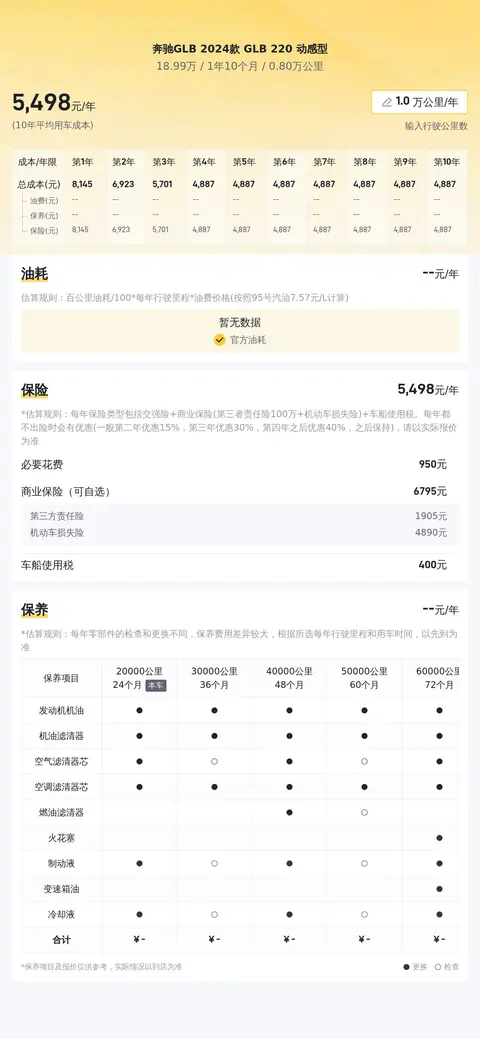 据估算,奔驰GLB 2024款 GLB 220 动感型的用车成本是7105元/年,2024款马自达CX-30是5878元/年,2024款沃尔沃XC40是8683元/年,与同级车相比,它的用车成本适中。