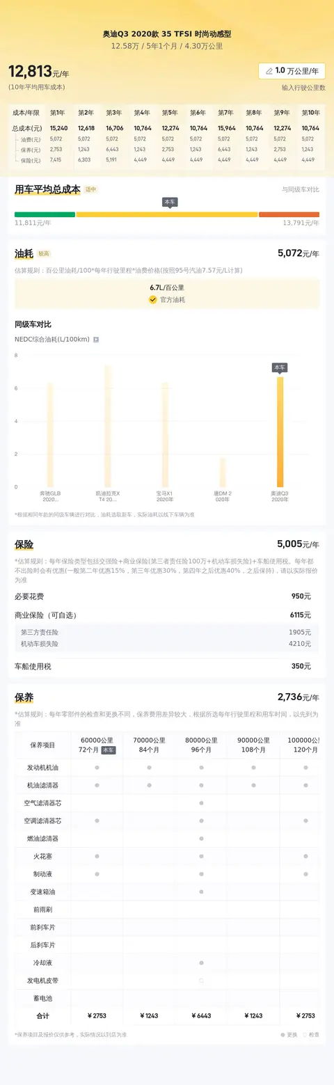 根据数据显示,这辆奥迪Q3 2020款 35 TFSI 时尚动感型的10年平均用车成本约为13437元/年,这一成本在同级别车型中处于适中的水平。具体来看,油耗成本方面,按照每年行驶2万公里计算,大约需要5681元/年,这样的油耗表现相当出色,既节省了燃油成本,也减少了对环境的影响。保险费用方面,每年约5547元,这样的保险费用涵盖了车辆的基本保障需求,为车主提供了充足的保障。至于保养费用,每年大约需要1209元,这样的保养费用包括了车辆的日常维护和定期检查,能够确保车辆的性能和寿命。总体来说,这辆车的用车成本相对合理,对于有意向购买的消费者而言,这样的成本并不会带来过大的负担。