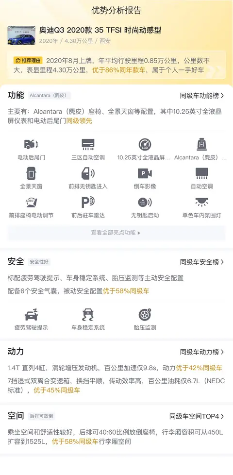 这辆奥迪Q3 2020款 35 TFSI 时尚动感型在内饰、动力、配置、安全、操控、舒适性和性价比等方面都表现出色。首先,内饰采用高档材质,设计时尚精致,为乘客提供了舒适的驾乘环境。其次,动力方面搭载1.4T涡轮增压发动机和7挡双离合变速箱,既能提供充沛的动力输出,又能保持良好的燃油经济性。配置方面,配备了Alcantara座椅、全景天窗、全液晶屏仪表和电动后尾门等先进配置,提升了驾驶的便捷性和舒适性。安全方面,拥有ABS防抱死、制动力分配、刹车辅助等多项主动安全配置,以及前后排安全气囊、侧安全气帘等被动安全配置,为乘客提供了全方位的保护。操控方面,悬挂系统调校得当,提供了良好的路感和操控稳定性。舒适性方面,座椅支撑性和包裹性都不错,长途驾驶也不会感到疲劳。最后,性价比方面,车主给出的报价低于市场价,对于有意向购买的消费者而言,这样的价格无疑是一个不错的选择。