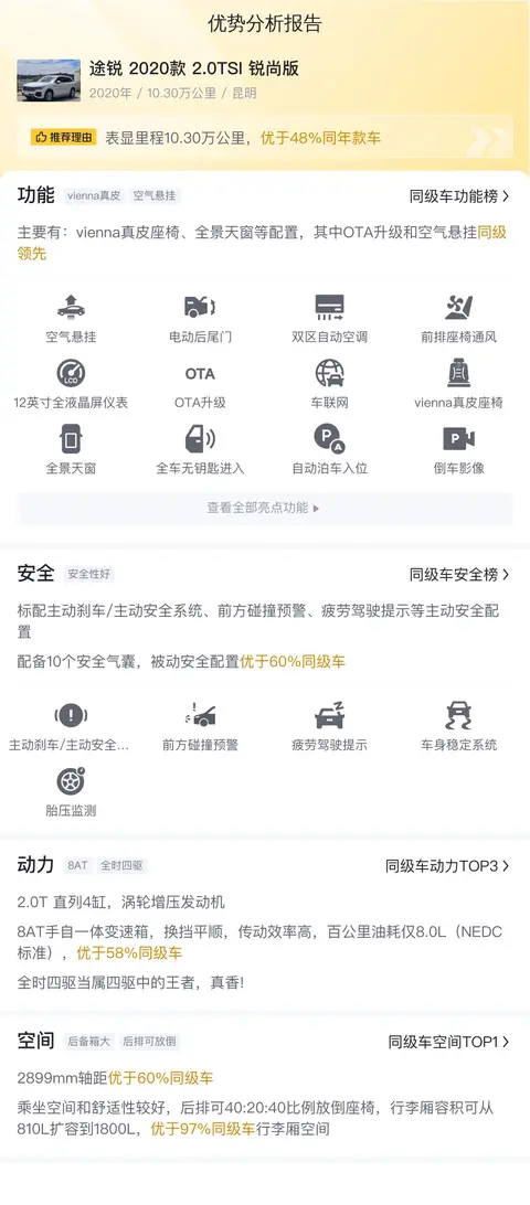 综上所述的新车含税价、用车成本、市场行情、优势分析、同款比价等数据仅供参考。在配置部分,因为二手车非标品,车辆可能会存在配置改装的情况,具体车况信息需要线下结合车辆实际情况进行综合参考。