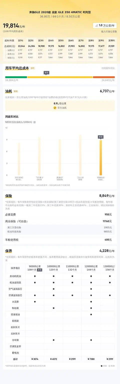 据估算,奔驰GLE 2020款 改款 GLE 350 4MATIC 时尚型的用车成本是21780元/年,同级车最低是16060元/年,最高是23776元/年,所以用车成本偏高。
