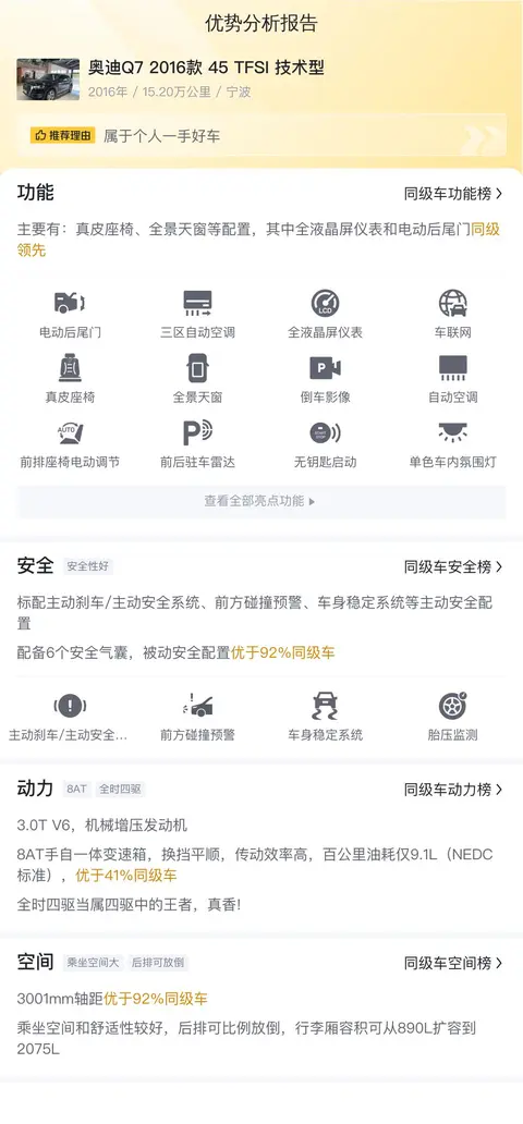 据估算,同级车的最低用车成本是16178元/年,最高是25717元/年,奥迪Q7 2016款 45 TFSI 技术型是21673元/年,用车成本适中。