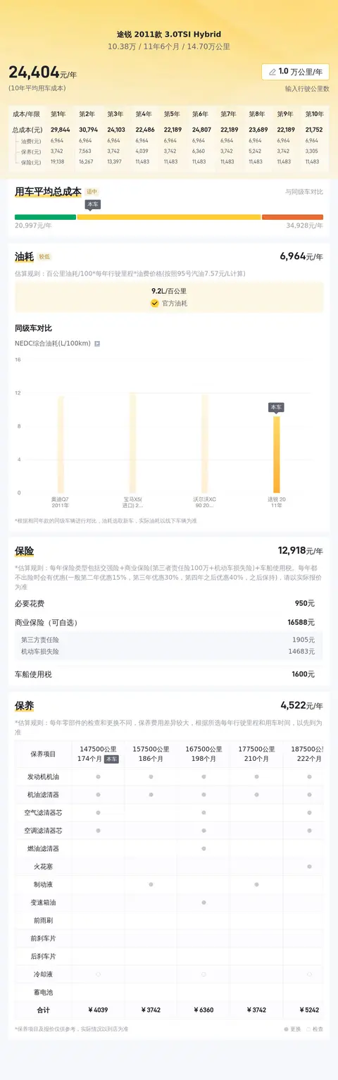 关于途锐 2011款 3.0TSI Hybrid 的用车成本,我们将通过同级别车型的对比分析,以图片形式向您展示该车的养车成本在同类车型中处于什么水平,帮助您更加清晰的了解这款车的使用成本。