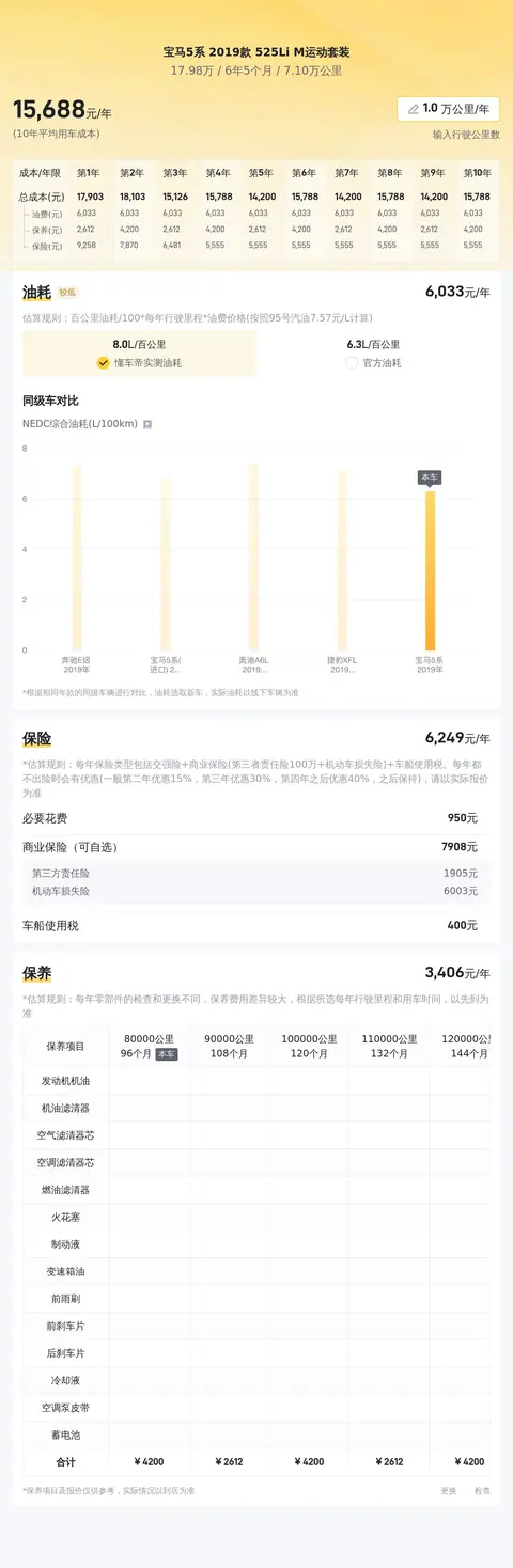 当前这款二手宝马5系的市场价格区间为17.07万至21.68万元,具体价格受车况等因素影响。经估算,该车的年均综合用车成本约为1.6万元,但会根据车主的实际使用情况有所变动。