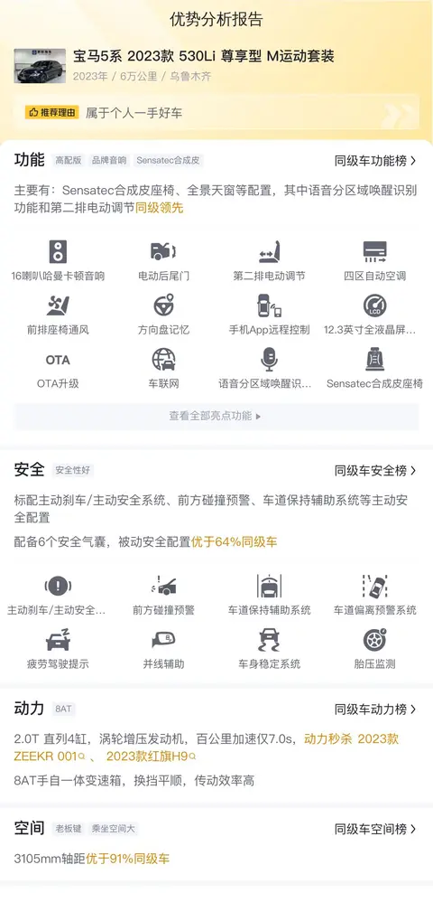 这款车主要有 Sensatec 合成皮座椅、全景天窗等配置,其中语音分区域唤醒识别功能和第二排电动调节同级领先。在动力方面,2.0T 直列 4 缸,涡轮增压发动机,百公里加速仅 7.0s,动力秒杀2023款ZEEKR 001(图片|配置|询价)、2023款红旗H9,8AT手自一体变速箱,换挡平顺,传动效率高。在空间方面,3105mm 轴距优于 91% 同级车。在价格方面,这款车的市场价格在43.66万至52.31万之间,而这款车的价格在29.48万,相较于新车含税价打了个半折,性价比高。这款车搭载的发动机和变速箱均为宝马核心技术,经过市场验证,性能和可靠性表现出色。且宝马品牌在运动性和操控性方面有着良好的口碑,车主群体广泛。