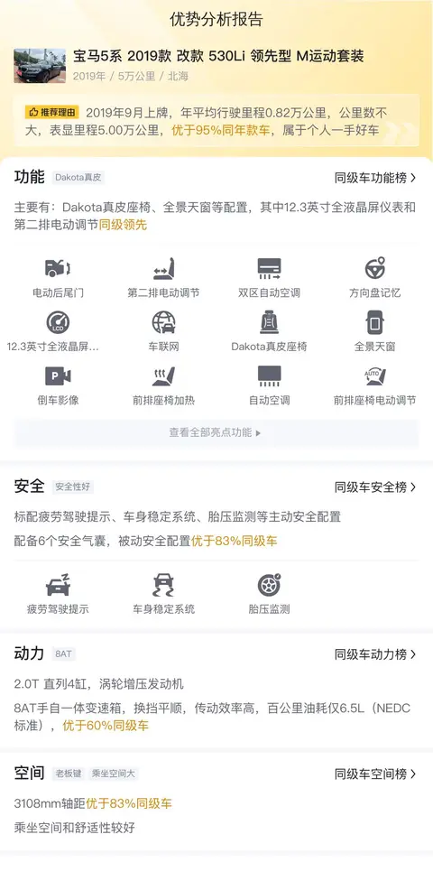 这辆宝马5系 2019款 改款 530Li 领先型 M运动套装的优点主要包括其强大的动力性能、出色的操控性以及丰富的配置。2.0T发动机配合8速变速箱,不仅动力充沛,燃油经济性也表现不俗。双区空调、全景天窗等配置则提升了驾乘的舒适性和便利性。