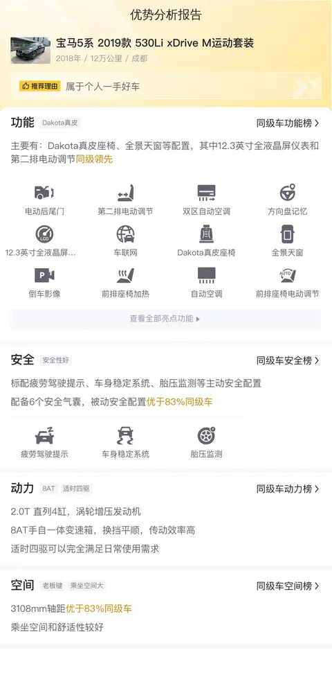 据估算,同级车的最低用车成本是11778元/年,最高是23786元/年,宝马5系 2019款 530Li xDrive M运动套装是17658元/年,用车成本适中。
