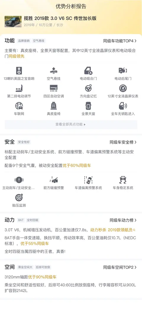 综上所述的新车含税价、用车成本、市场行情、优势分析、同款比价等数据仅供参考。在配置部分,因为二手车非标品,车辆可能会存在配置改装的情况,具体车况信息需要线下结合车辆实际情况进行综合参考。
