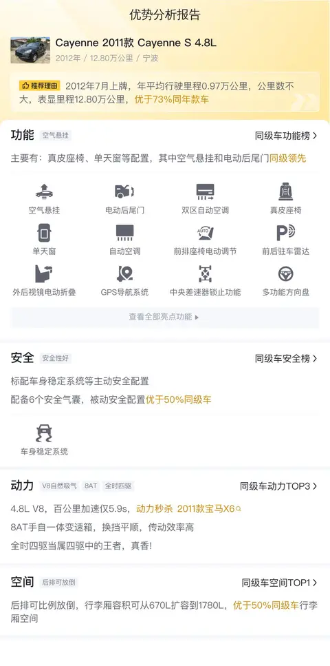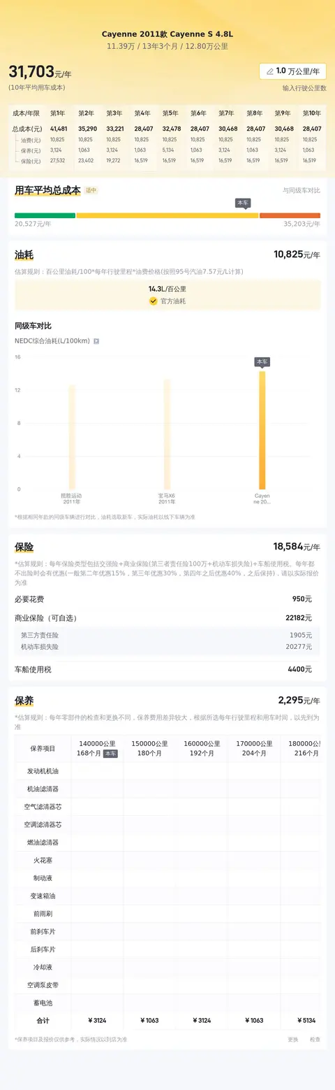 据估算,同级车的最低用车成本是21709元/年,最高是37276元/年,Cayenne 2011款 Cayenne S 4.8L是32187元/年,所以用车成本不算低。