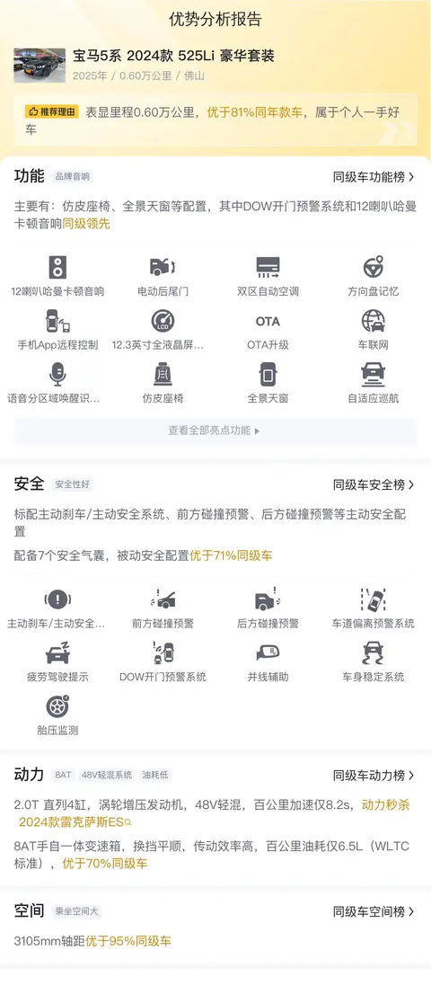 车是好车,价格怎么样呢?目前这款车的二手车市场行情大约在28.57万至34.55万之间,具体售价因车辆状况而有所不同。文中介绍的这款车型为2024款525Li豪华套装,车源地和上牌地均为佛山,上牌时间为2025年7月,表显里程0.6万公里,新车指导价43.99万,二手车报价31.8万,过户次数0次。该车里程少,车龄小,外观颜色为最受欢迎的黑色,综合性价比指数79%,确实是一辆难得的好车,值得考虑。