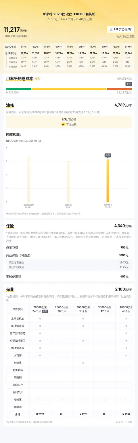 用车成本方面,经估算,这辆帕萨特 2023款 改款 330TSI 精英版的年均综合用车成本大概在每年1.2万元左右,实际费用跟车主的使用习惯和行驶里程有直接关系。