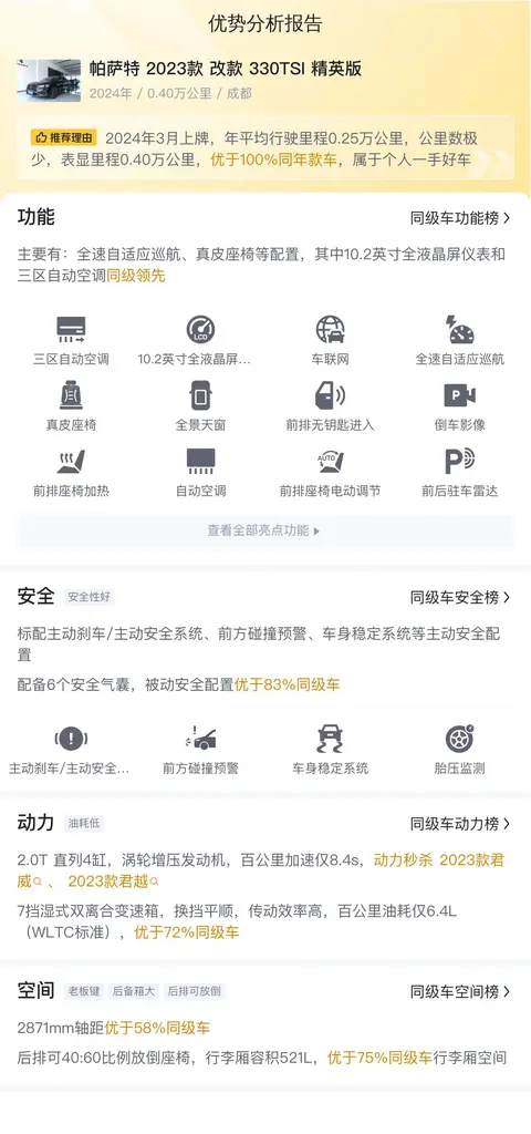 这辆帕萨特 2023款 改款 330TSI 精英版的主要优势在于其出色的动力性能和高效的燃油经济性。此外,车辆的内饰舒适且具有较高的品质感,为乘客提供了良好的乘坐环境。在配置方面,它也表现出色,具备多种实用功能。