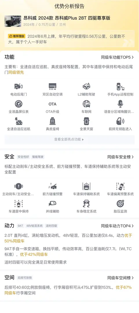 综上所述的新车含税价、用车成本、市场行情、优势分析、同款比价等数据仅供参考。在配置部分,因为二手车非标品,车辆可能会存在配置改装的情况,具体车况信息需要线下结合车辆实际情况进行综合参考。