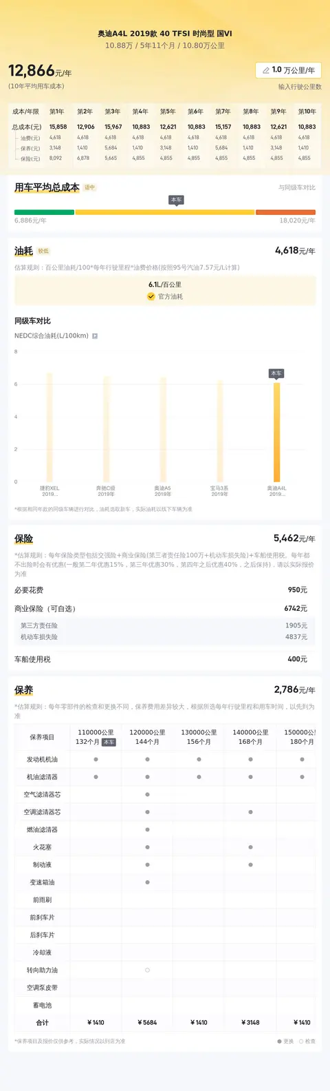 懂车帝平台数据显示,这辆奥迪A4L 2019款 40 TFSI 时尚型 国VI的市场售价在10.87-13.62万元之间,实际售价受车辆状况等因素影响。年度用车成本估算为13055元(按每年行驶2万公里计算),实际费用根据使用情况和保养情况会有所变化。养车成本包括油费、保养费、保险费等,具体费用可能因个人驾驶习惯、用车频率等因素而有所不同。
