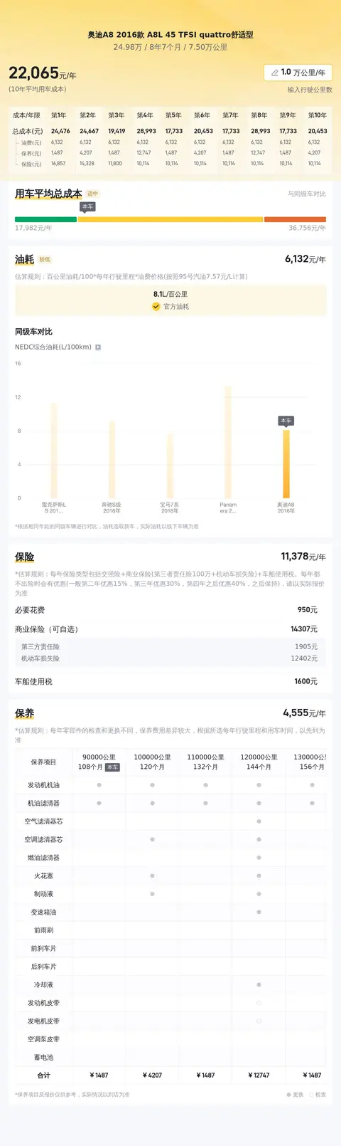 根据懂车帝对这款车的分析,奥迪A8L 2016款 A8L 45 TFSI quattro 舒适型的10年平均用车成本大约为23,588元/年,这包括油费、保险费和保养费用等。具体费用可能会根据个人驾驶习惯、使用频率和地区差异等因素有所不同。