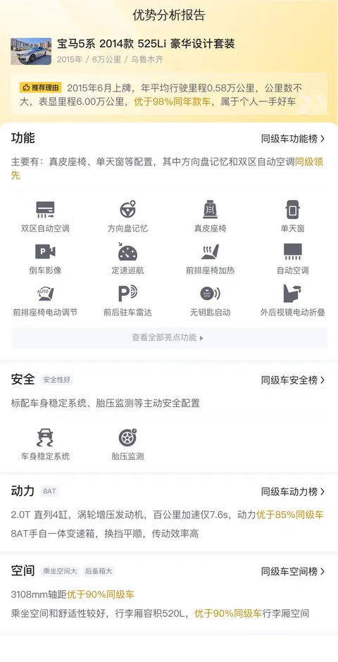 综上所述的新车含税价、用车成本、市场行情、优势分析、同款比价等数据仅供参考。在配置部分,因为二手车非标品,车辆可能会存在配置改装的情况,具体车况信息需要线下结合车辆实际情况进行综合参考。