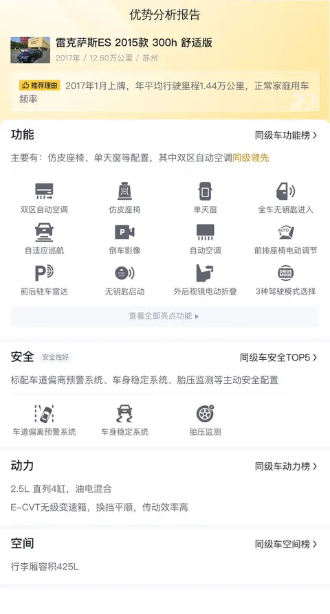 2012年雷克萨斯ES在中国大陆地区累计销量突破10万辆,成为雷克萨斯在中国销量最高的车型。2018年全新一代ES车型基于GA-K平台打造,在底盘、车身刚性、悬架系统以及转向系统等方面进行了全面升级。今天这辆雷克萨斯ES 2015款 300h 舒适版是2017年1月上牌,跑了有12.6万公里,但只要14.98万,性价比还是很高的。