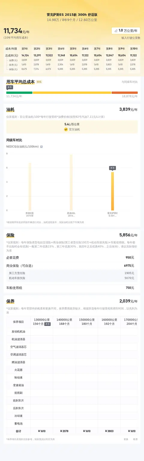 这辆二手雷克萨斯ES 2015款 300h 舒适版,按照每年行驶2万公里计算,10年平均用车成本大约在23807元/年。油耗方面,混动车型较省油,按照每年行驶20000公里,每升汽油6.5元计算,每年燃油费用大约为10896元,实际费用根据用车强度和油价波动而有所不同。保险方面,每年费用大约为6684元,包括交强险、商业险等,具体费用根据投保内容和保险公司政策而定。保养方面,每年费用大约为2228元,包括常规保养和可能的维修费用,实际费用根据车辆状况和保养内容而定。