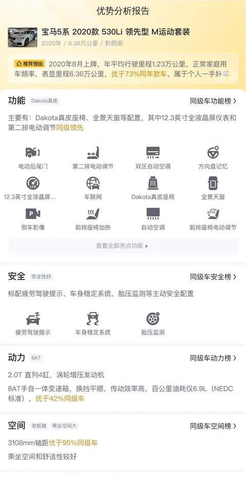 咱们今天介绍的这一款宝马五系2020款530Li领先型M运动套装,属于2019年10月21日宝马公司上市的十款2020五系Li车型之一。该车完全公开了所有信息,无任何隐瞒,可全面检测,接受您的品鉴!该车目前位于黔西南布依族苗族自治州兴义市坪东大道,兴义市瑞麟二手车交易市场内,车牌地为黔西南布依族苗族自治州,首次上牌时间为2020年8月,表显里程6.3万公里,新车指导价46.69万,二手车报价22.98万,车身颜色为白色,过户次数0次。