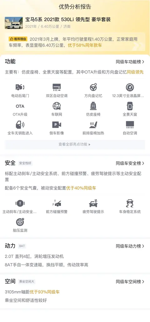 宝马作为全球知名的传统豪华汽车品牌三驾马车之一,在同级别车型中配置一般,但自有其特色。这辆车仿皮座椅、全景天窗等配置,其中OTA升级和方向盘记忆同级领先。从安全配置方面来看,这辆车配备6个安全气囊,使其被动安全配置优于50%同级别车型。从功能配置方面来看,这辆车配备有全景天窗、手机App远程控制、第二排电动调节等配置,其中手机App远程控制和第二排电动调节同级领先。值得一提的是,这辆车配备有OTA升级,系统可以实时更新,让车常用常新。