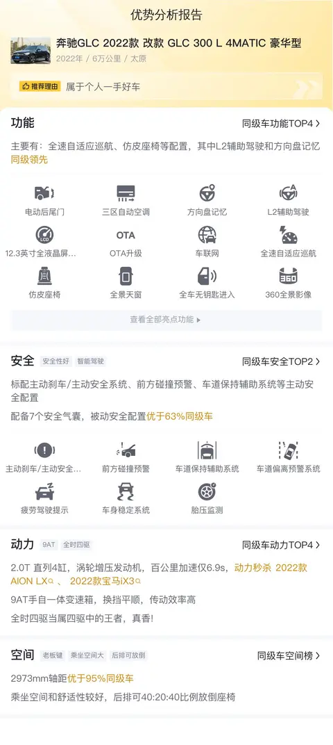 综上所述的用车成本、市场行情、优势分析、同款比价等数据仅供参考,车况信息需要线下结合车辆实际情况进行综合参考,25.98万的报价对于这辆奔驰GLC 2022款 改款 GLC 300 L 4MATIC 豪华型来说,属于中规中矩,不高也不低,还是要看车子具体情况和自己购买的意愿程度。这辆奔驰GLC 2022款 改款 GLC 300 L 4MATIC 豪华型,基础配置在线,而且动力强悍,是一辆能够带来驾驶乐趣的豪华中型SUV,奔驰品牌背书,品质也有保证,唯一需要考虑的就是养护成本较高,还是要量力购买。