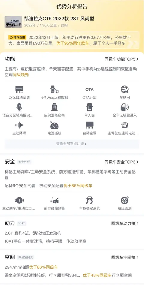先让我们来了解一下这辆二手凯迪拉克CT5的基本情况,该车具体版本为——凯迪拉克CT5 2022款 28T 风尚型,车身颜色为白色,2022年12月在昆明上牌,表显里程1.9万公里,0过户。新车指导价27.97万,目前二手车报价15.9万。