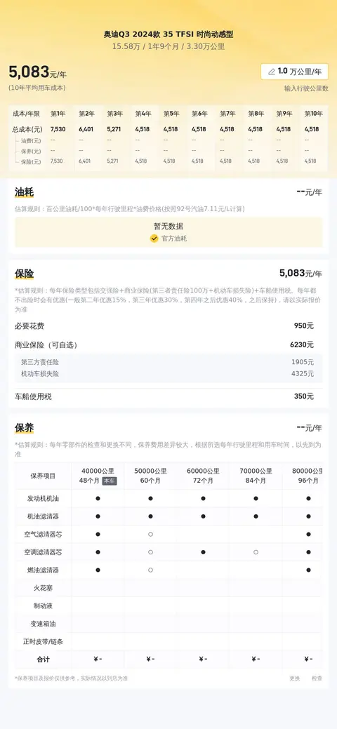 在用车成本方面,这辆奥迪Q3 2024款 35 TFSI 时尚动感型的10年平均成本约为11670元/年(按每年行驶1万公里计算),而同级车的最低10年平均成本约为9460元/年,最高则可达14138元/年。因此,可以说奥迪Q3 2024款 35 TFSI 时尚动感型的用车成本处于同级车中的合理水平。值得一提的是,由于这辆车的车龄较短,所以前三年的保养费用会相对较低。