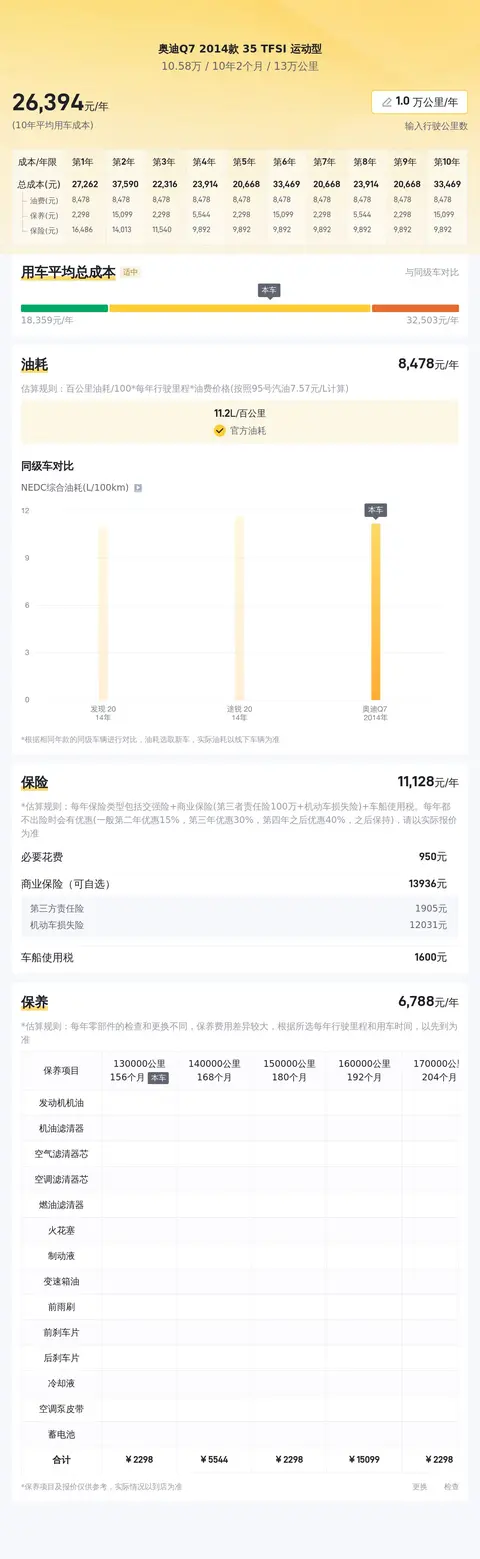 据估算,奥迪Q7 2014款 35 TFSI 运动型的用车成本较低,因为同级车的最低用车成本是25953元/年,最高是45783元/年,奥迪Q7 2014款 35 TFSI 运动型是26160元/年,所以较低。