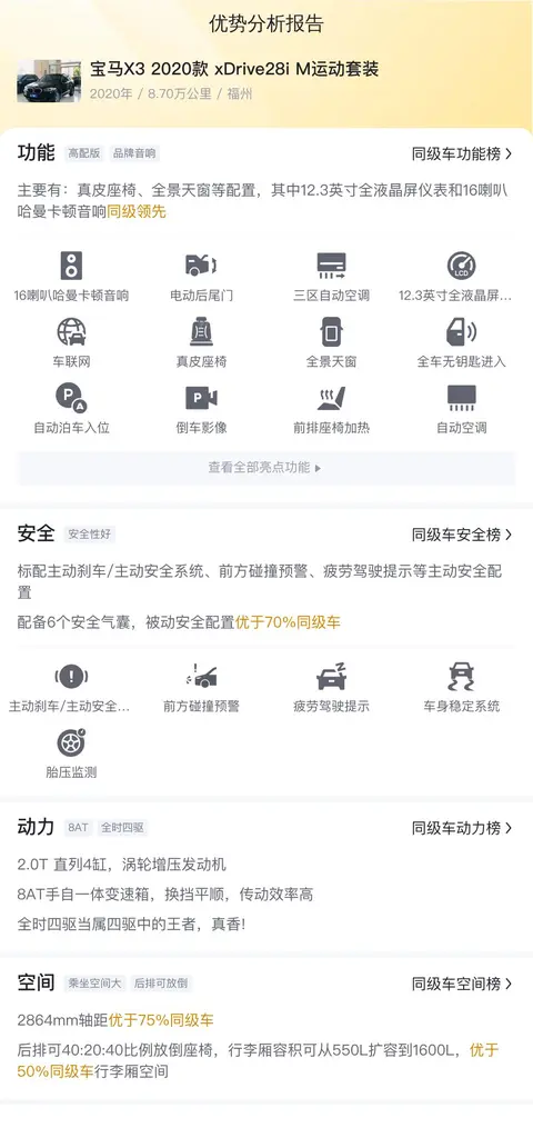 好了,以上就是我们对这台宝马X3 2020款 xDrive28i M运动套装的全部介绍了,如果您正在寻找一台运动套装外观优美、内饰豪华、配置丰富且动力强劲的二手车,那么这台宝马X3 一定是您的理想之选!