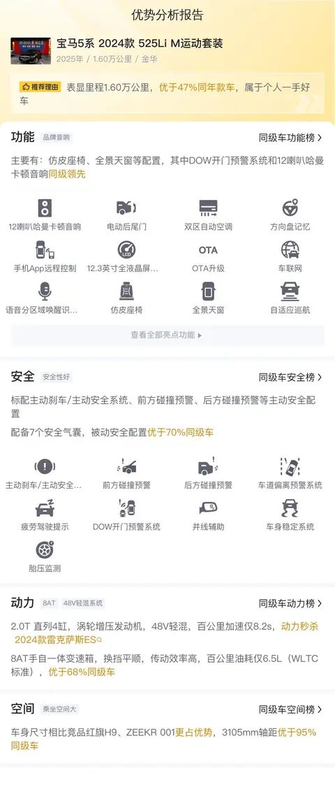 综上所述,2024款宝马5系525Li M运动套装在动力、操控、配置以及品牌影响力等方面都展现出了不俗的实力。与红旗H9和沃尔沃S90相比,宝马5系在保持豪华感和舒适性的同时,更加注重驾驶乐趣和运动感。如果您是一位追求卓越驾驶体验的消费者,那么宝马5系无疑是您的理想之选。但如果您更加注重舒适性和尊贵感,或者对环保和安全有更高要求,红旗H9和沃尔沃S90也是不错的选择。总之,在购买豪华中大型轿车时,消费者可以根据自己的需求和偏好来进行选择,每一款车型都能为您带来不一样的驾乘体验。