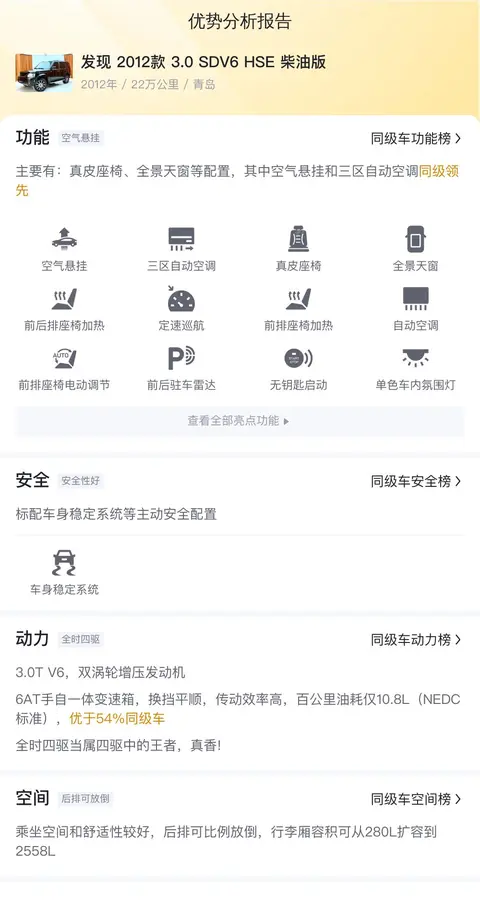 综上所述的新车含税价、用车成本、市场行情、优势分析、同款比价等数据仅供参考。在配置部分,因为二手车非标品,车辆可能会存在配置改装的情况,具体车况信息需要线下结合车辆实际情况进行综合参考。