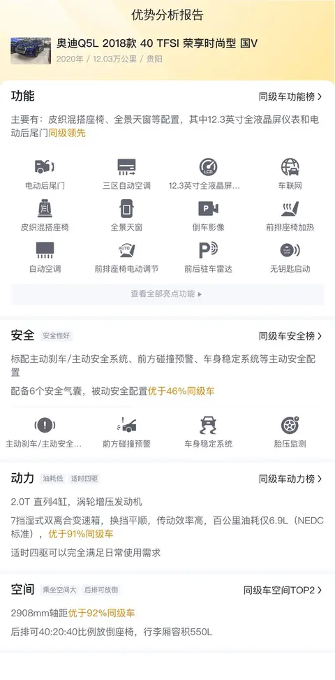 综上所述的新车含税价、用车成本、市场行情、优势分析、同款比价等数据仅供参考。在配置部分,因为二手车非标品,车辆可能会存在配置改装的情况,具体车况信息需要线下结合车辆实际情况进行综合参考。