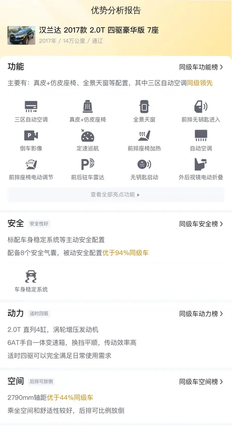作为一款已经行驶了 14 万公里的二手车,这辆汉兰达 2017 款 2.0T 四驱豪华版 7 座在配置、安全、动力性能以及驾乘感受等方面依然表现出色。其丰富的配置、出色的动力性能和宽敞舒适的内部空间,使其成为了一款性价比较高的二手车选择。然而,由于该车已经行驶了较远的距离,潜在买家在购买前应该仔细检查车辆的各项状况,确保其能够满足自己的使用需求。同时,车辆的售价也应该考虑到其行驶里程和车况等因素,以确保购买价值。