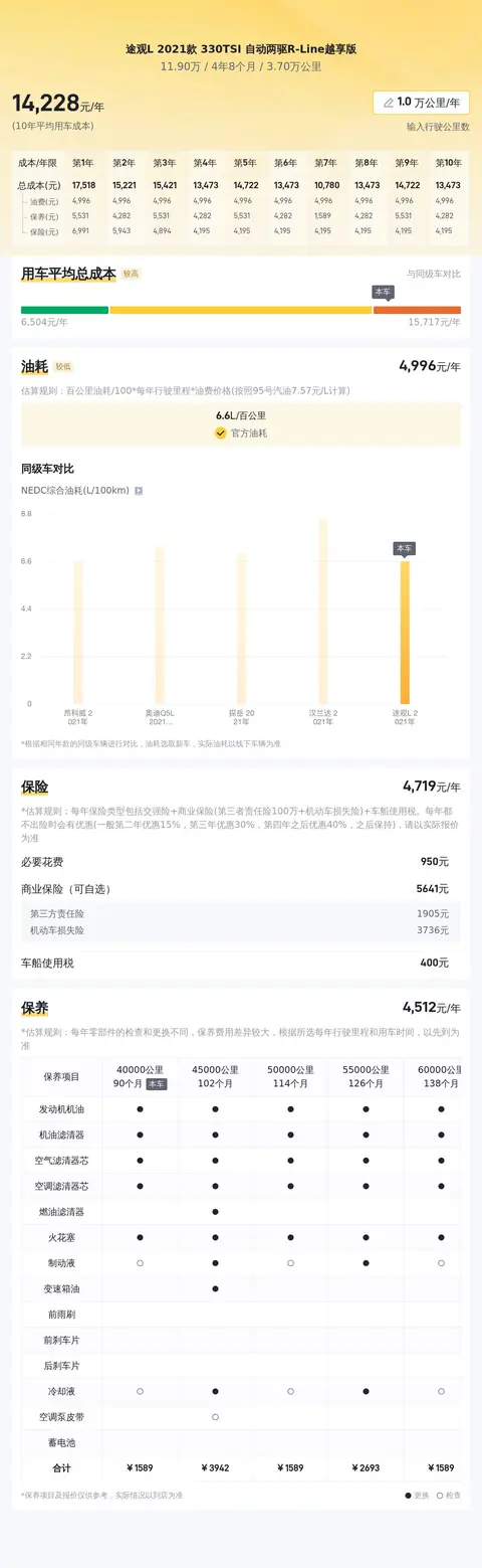 这款车百公里油耗为6.6升,按一年行驶2万公里计算,油费约为11466元,再加上每年约5105元的保险费用和其他费用,总用车成本大约为每年16571元。这一费用在同级别车型中属于适中水平,但对于日常通勤和长途旅行来说,仍然具有较高的性价比。
