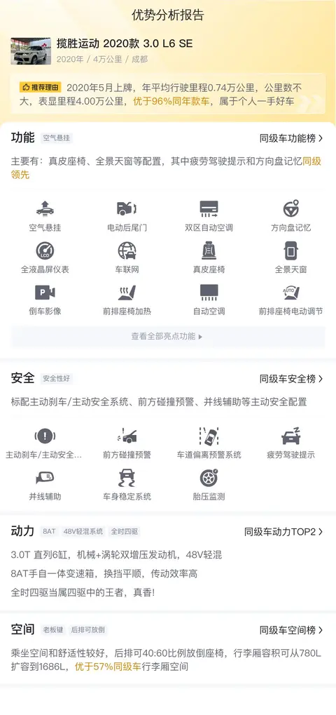 综上所述的新车含税价、用车成本、市场行情、优势分析、同款比价等数据仅供参考。在配置部分,因为二手车非标品,车辆可能会存在配置改装的情况,具体车况信息需要线下结合车辆实际情况进行综合参考。