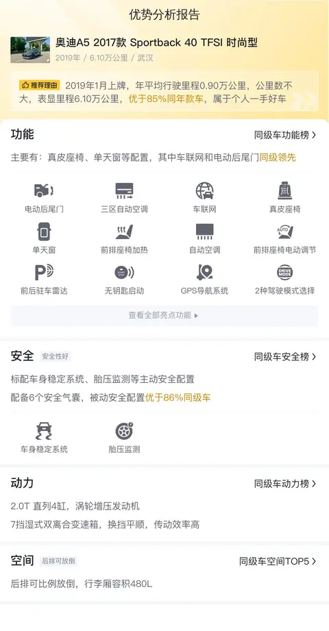 这辆车作为奥迪A5的入门车型,配置还是偏少,并且木纹装饰板划痕较多,车机也没有Carplay手机互联,不太方便。车型毕竟是2019年上牌的,已经有六年的车龄,发动机和变速箱可能存在老化问题,需要特别留意。