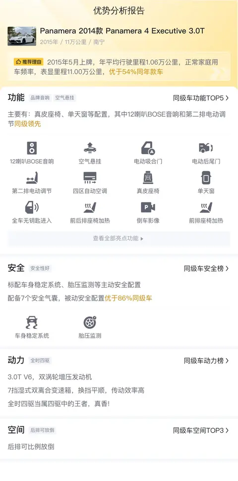 这辆二手保时捷Panamera的10年平均用车成本为21177元/年,与同级车相比处于适中的水准,而其能效比则为71%,与动辄上百万元的新车指导价相比,这个能效比还是相当不错的。
