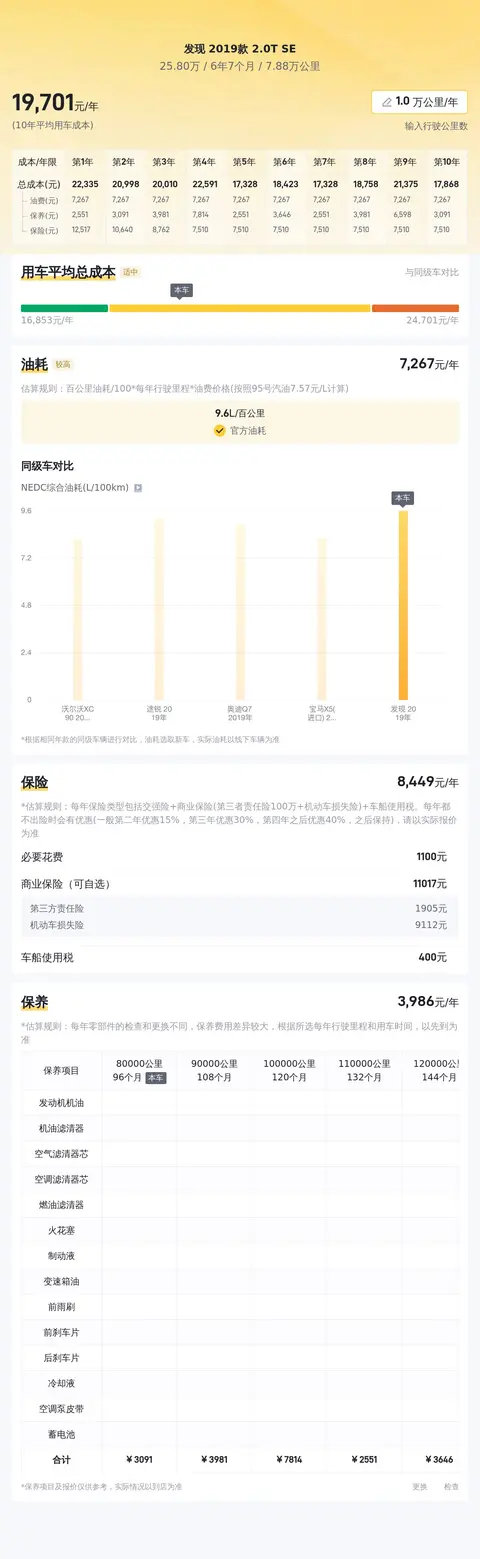 用车成本方面,我们分析了这款车的大数据分析,该车的十年平均用车成本大约在21103元/年,这个用车成本在同级别车型里面处于适中的水平,具体的实际费用开销可能会根据用车强度和环境等因素有所改变。