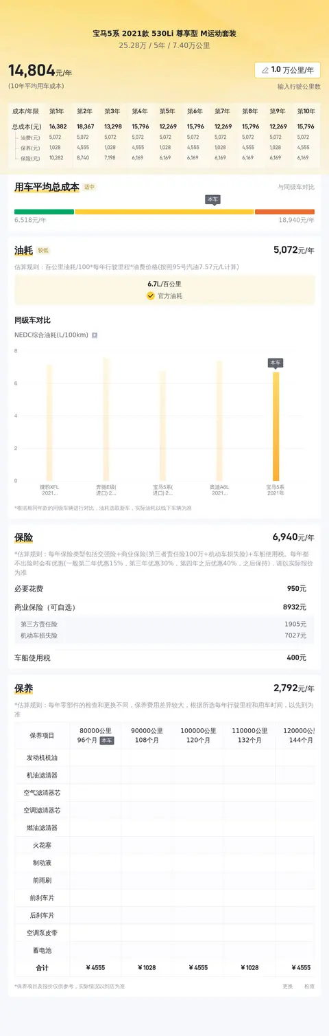 在购买二手车时,除了考虑车辆的价格外,还需要关注车辆的日常使用和维护成本。一般来说,车辆的使用成本包括油费、保险费、保养费等。根据车主反馈和市场数据,我们可以大致估算出这款车型的平均使用成本。首先,油费方面,该车型的百公里综合油耗大约为6.7升。按照当前油价计算,每年的油费大约在5000元左右(假设每年行驶2万公里)。其次,保险费方面,该车型的保险费用大约在8000元左右(包括交强险和商业险)。最后,保养费方面,该车型的保养周期较长,且保养项目较少。因此,每年的保养费用相对较低,大约在2000元左右。综上所述,该车型的平均使用成本大约在1.5万元左右。不过,具体的使用成本还会因个人驾驶习惯、车辆状况等因素而有所不同。