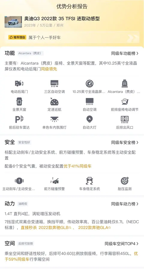 奥迪Q3 2022款 35 TFSI 进取动感型在配置、安全、动力、操控、驾乘感受与空间等方面均表现出色,是一款集豪华与实用于一体的SUV。无论是日常通勤还是周末出游,它都能为驾驶者和乘客带来优质的驾乘体验。如果你正在寻找一款性能卓越、配置丰富的二手车,那么这辆奥迪Q3无疑是一个值得考虑的选择。