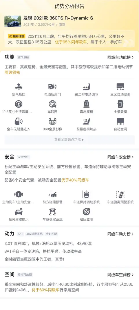 这辆路虎发现2021款360PS R-Dynamic S在动力性能、配置丰富度、舒适性以及安全性等方面都表现出色,同时较高的离地间隙和较强的通过性使得其在非铺装路面上的表现优于大多数同级别车型。然而,相对较高的用车成本和较大的车身尺寸可能在城市拥堵路况下表现一般。