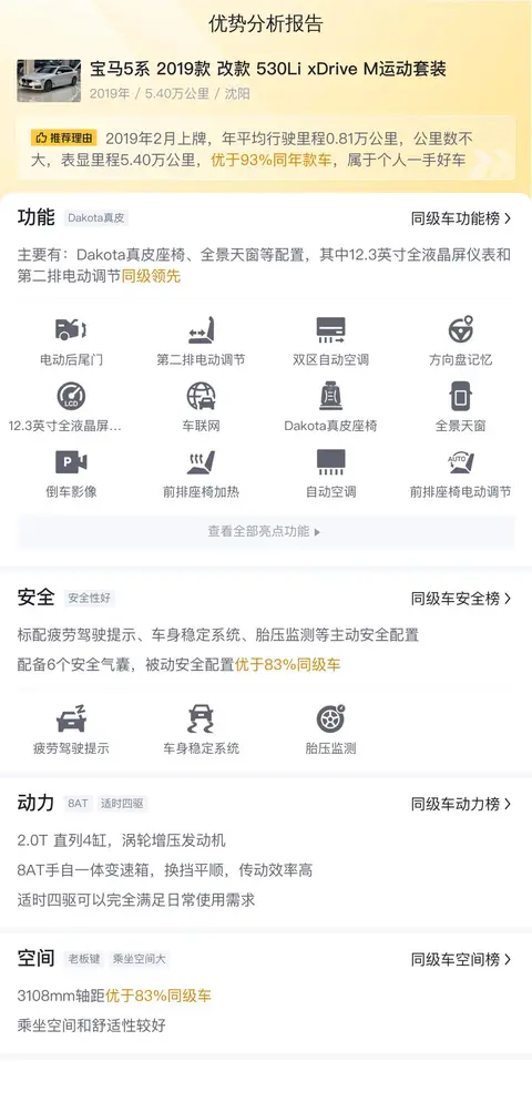 买二手车,配置要实用。这辆宝马5系 2019款 改款 530Li xDrive M运动套装配备了全景天窗、驻车雷达、前后排座椅加热、方向盘记忆等配置。安全配置上,标配主动刹车/主动安全系统、前方碰撞预警、疲劳驾驶提示等主动安全配置,配备6个安全气囊,被动安全配置优于70%同级车。