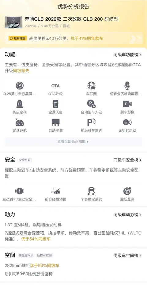 虽然是两年前的车,但配置还是很丰富的。奔驰GLB 2022款 二次改款 GLB 200 时尚型配备了仿皮座椅、全景天窗、语音分区域唤醒识别、OTA升级等配置,其中语音分区域唤醒识别和OTA升级同级领先。